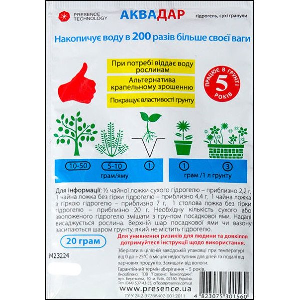 Гидрогель - это влагоудерживатель, который вводиться в почву или материалы, абсорбирует и удерживает большое количество воды и питательных веществ. В отличие от большинства продуктов, поглощающих воду, Аквадар имеет свойство легкой отдачи абсорбируемой воды и питательных веществ, предоставляя ее растениям. Эта функция именуется циклами отдачи. Аквадар выполняет множество необходимых функций для обеспечения жизнедеятельности растений, где составными компонентами являются вода, минералы, воздух, структуризация почвы.