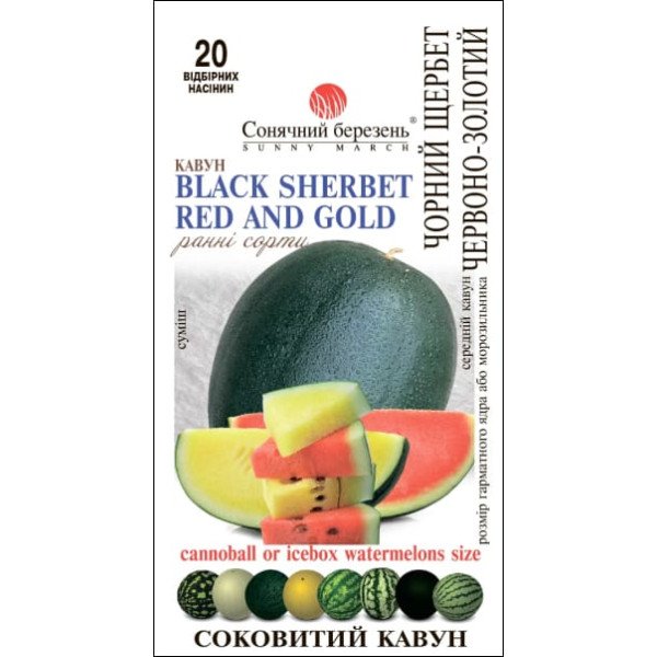 Эксклюзивная смесь черных округло-овальных арбузов, очень похожих между собой, среднеранних по срокам созревания (около 100 дней от всходов) чуть больше порционного размера Icebox (легко помещается в холодильник), весом 8-10 фунтов (4-5 кг). Когда настает время уборки (вторая половина лета в условиях Украины), эти практически одинаковые растения преподнесут вам сюрприз: вы увидите особенность этой Rainbow Sherbet (Радуги Щербета). Одна половина арбузов будет насыщенно красными внутри, вторая - горячего желтого цвета. Их хрустящая нежная мякоть одинаково медово-сладкая, (когда они полностью созревают), сочная и освежающая с особенным тропическим щербето-подобным ароматом.