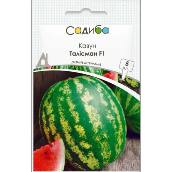 Талисман F1 - новый ранний гибрид арбуза. Растение сильное, продуктивное, з сильным развитием, формирует хороший листовой покров. Плоды округлой формы с красивыми широкими темными полосами, очень однородны по весу, от 10 до 12 кг. Мякоть ярко-красная с хорошей структурой. Адаптирован к различным условиям и способам выращивания.