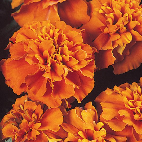 Tagetes patula Janie Orange. Низкорослая серия бархатцев, высотой 20-25 см. Соцветия-корзинки махровые, крупные 5-6 см в диаметре. Характеризуется ранним и продолжительным цветением, крупными цветами, компактным габитусом, однородностью и высоким качеством растений в широком диапазоне выращивания. Быстрорастущее, свето-, теплолюбивое, неприхотливое к почве и влаге растение. Для раннего цветения семена высевают на рассаду в начале апреля. Всходы появляются через 5-6 дней, пикировку проводят в фазе 2-3 настоящих листочков. На постоянное место высаживают, когда минует угроза заморозков. Посев в открытый грунт проводят в мае на глубину 1,5-2 см. Рекомендуется для клумб, рабаток, ваз и балконов.