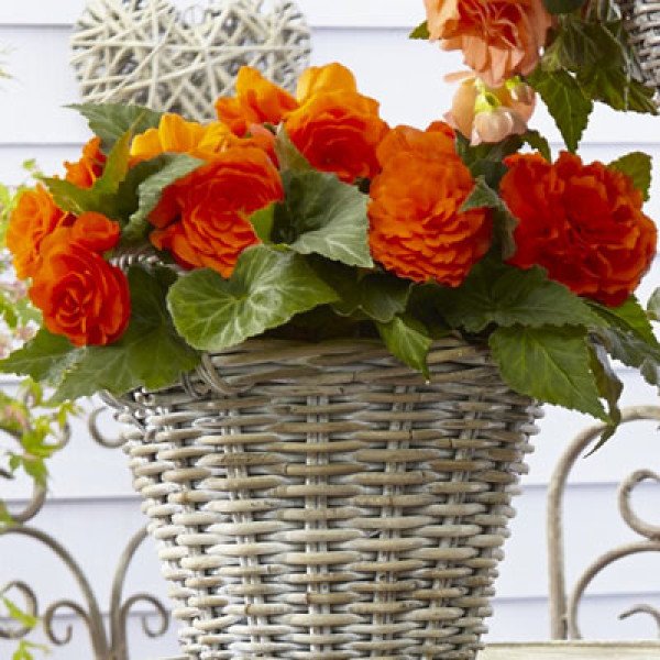 Begonia tuberosa GO-GO F1 orange. Замечательное комнатное растение, высотой 20-25 см, с крупными, махровыми цветами разнообразной окраски и длительным периодом цветения. Семена высевают в конце декабря - начале марта, не засыпая почвой. Посевы держат под стеклом или пленкой до первой пикировки, равномерно увлажняя землю теплой водой с поддона. Пикируют на стадии 2-3 настоящих листочков. Растения неприхотливы, хорошо переносят пересадку в любом возрасте. После отцветания надземная часть отмирает или ее обрезают. Клубни можно сохранить до следующего сезона в горшке, в прохладном месте при температуре 14-16 ⁰C, лишь изредка увлажняя землю. Используется как горшечное растение в оформлении интерьеров, садовых бордюров, массивов и контейнеров.