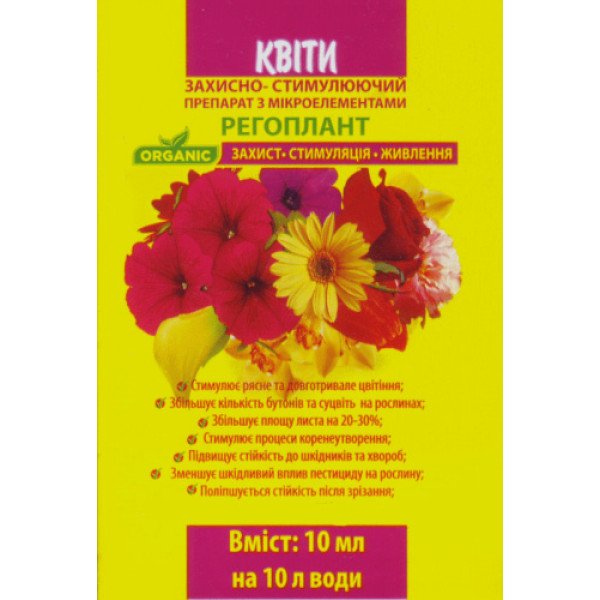Регоплант для цветов - новый защитно-стимулирующий препарат, который активизирует основные процессы дыхания и питания растений, иммунную систему, предотвращает появление и развитие болезней, уменьшает фитотоксическое действие пестицидов и других химических остатков, способствует лучшему развитию корневой системы и увеличению площади листовой поверхности, за счет чего растение лучше переносит засухи и высокие температуры. Быстро поглощается растением ( 2-3 часа ).