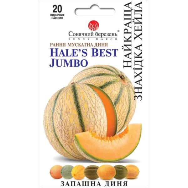 Созданная в Калифорнии в 1924-м году, эта дыня до сих пор еще широко популярна, потому что сочетает превосходный вкус с чрезвычайной скороспелостью и лежкостью. Считается лучшей из мускатных дынь из-за высокого содержания сахара, гладкой текстуры и амброзийного аромата. Дыни Hales Best Jumbo растут на сильных, энергичных лозах длиной 1,5- 2 метра. Овальные плоды созревают через 60-70 дней после всходов, достигая больших размеров и веса от 2 до 3 кг. Это с красивым овалом дыни с темно-зеленой кожей и плотной густой золотой сеткой на небольших аккуратных ребрах. Мякоть необычайно вкусна- сильно душистая, очень сочная, но с приятной твердой текстурой, дающий хрустящий «укус». И это в основном оранжево-красное, цвета лосося мясо- полость семян мала и кожура достаточно тонкая. Этот сорт больше устойчив к засухе, чем большинство других, лучше всего растёт именно при жаркой погоде.