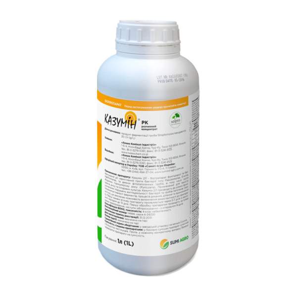 Казумин - системный бактерицидный фунгицид лечебного действия, основной сферой применения которого является лечение бактериозов вызванных бактериями Erwinia, Pseudomonas, Xantomonas. Казумин влияет на пролиферацию (деление и размножение) клеток бактерий останавливая синтез белка, влияет на РНК, в результате чего останавливается рост и размножение бактерий.