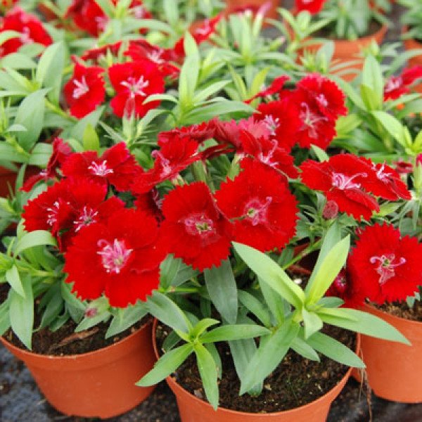 Гвоздика межвидовая Чиба F1 скарлет представляет собой растение, отличающееся чрезвычайно ранним периодом цветения. Это представитель ранней низкорослой серии, высота которой в горшке составляет 20-25 см, а ширина - 20-25 см. Она характеризуется компактной формой куста, хорошо развитым ветвлением и устойчивостью к неблагоприятным погодным условиям. Цветы отличаются насыщенными оттенками, а цветение обильное и продолжительное. Используется эта гвоздика для оформления клумб, бордюров и балконов, причем ее легко выращивать как в горшках, так и в контейнерах.