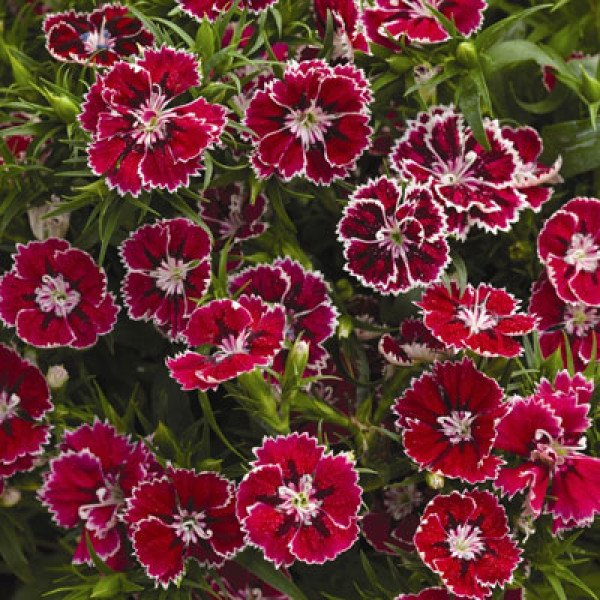 Компактное растение, высотой 40 - 45 см и шириной 45 - 50 см. Образует аккуратный куст и полностью заполняет контейнер. Крупные ароматные цветы двухцветной окраски - карминовые лепестки со светлым центром и таким же обрамлением. Гвоздика цветёт начиная с весны и до самой осени. Идеально подходит для садовых контейнеров, вазонов и на срез. Может использоваться на срез. Цветение через 16-19 недель.