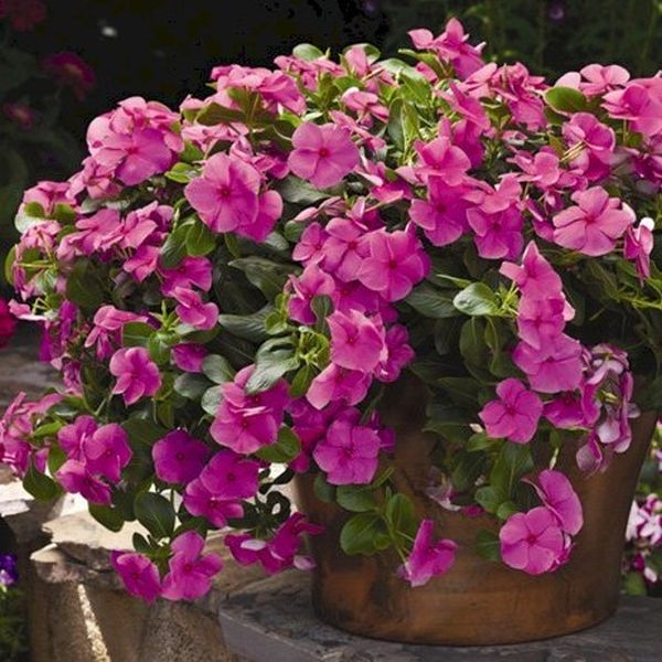 Катарантус Кора Каскад F1 лиловый - это компактное растение с высотой куста от 30 до 40 см. Оно характеризуется высокой устойчивостью к повышенным температурам и интенсивному солнечному излучению. Цветки культуры имеют внушительные размеры, достигая 3-4 см в диаметре, и представлены в широкой цветовой гамме. Катарантус отличается неприхотливостью к условиям выращивания, что делает его ценным декоративным растением, способным обеспечивать обильное и продолжительное цветение. Благодаря своим эстетическим характеристикам, эта серия прекрасно подходит для выращивания в подвесных корзинах и больших контейнерах. Период развития растения после высадки в горшки составляет примерно 8-11 недель.