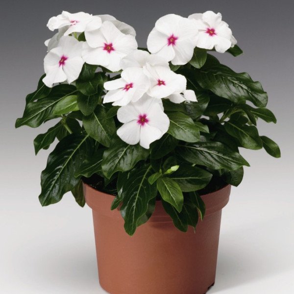 Катарантус СанШторм F1 белый с глазком - это раннецветущая однолетняя декоративная культура, принадлежащая к компактным сортам. Растение достигает высоты 20-25 см, а его ширина составляет 25-30 см. Куст характеризуется хорошо развитым ветвлением, а его листья имеют насыщенный темно-зеленый цвет. Соцветия отличаются внушительными размерами и интенсивной окраской.