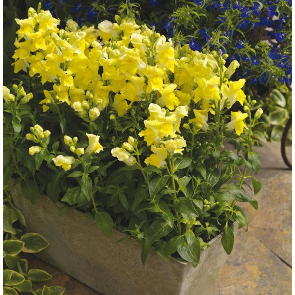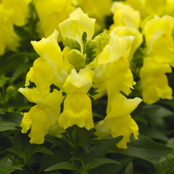Antirrhinum majus Montego F1 yelloy. Ранняя карликовая серия. Отличается компактным ростом, хорошим ветвлением, однородностью. Высота - 15-20 см. В период цветения растения обильно покрыты крупными цветами ярких расцветок. Используется для озеленения клумб, бордюров и балконов. Прекрасно подходит для выращивания в кассетах и горшках небольшого размера. Время выращивания после посадки в горшки - 7-9 недель. Светолюбивое, холодостойкое растение, предпочитает легкие, дренированные, плодородные почвы. Посев на рассаду проводят в марте, поверхностно. При температуре 20-24 °С всходы появляются через 7-14 дней. Растения растут медленно, очень чувствительны к избытку влаги, поражаются грибковыми заболеваниями. В открытый грунт высаживают в мае, на расстоянии 15-20 см. На постоянное место высевают в апреле. Растения можно пересадить в горшок и перенести в прохладное помещение, при температуре не выше 15 °С цветение продлится всю зиму. Прекрасно смотрится в контейнерах, горшках и вазонах.