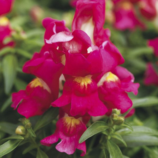 Antirrhinum majus Montego F1 pink bicolor. Ранняя карликовая серия. Отличается компактным ростом, хорошим ветвлением, однородностью. Высота - 15-20 см. В период цветения растения обильно покрыты крупными цветами ярких расцветок. Используется для озеленения клумб, бордюров и балконов. Прекрасно подходит для выращивания в кассетах и горшках небольшого размера. Время выращивания после посадки в горшки 7-9 недель. Светолюбивое, холодостойкое растение, предпочитает легкие, дренированные, плодородные почвы. Посев на рассаду проводят в марте, поверхностно. При температуре 20-24 °С всходы появляются через 7-14 дней. Растения растут медленно, очень чувствительны к избытку влаги, поражаются грибковыми заболеваниями. В открытый грунт высаживают в мае на расстоянии 15-20 см. На постоянное место высевают в апреле. Растения можно пересадить в горшок и перенести в прохладное помещение, при температуре не выше 15 °С цветение продлится всю зиму. Прекрасно смотрится в контейнерах, горшках и вазонах.