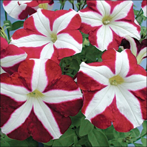Очень эффектная гибридная форма, устойчива к неблагоприятным погодным условиям. Растение сильноветвящееся, обильно и продолжительно цветущее. Цветки очень оригинальной окраски: пурпурно-красные полосы чередуются с белыми, диаметром 7-10 см. Петуния светолюбива, относительно засухоустойчива, хорошо растет на плодородной почве. Используется на клумбах, рабатках, бордюрах, в групповых посадках, хорошо смотрится в вазонах, балконных ящиках. Раннее прищипывание верхушки позволит получить пышноцветущее растение.