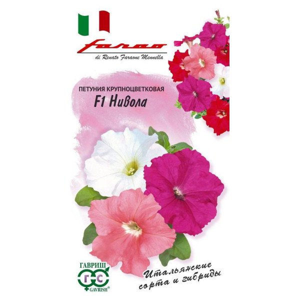 Роскошная смесь крупноцветковых, непрерывно цветущих, с абсолютно новой полуампельной формой, петуний итальянской серии «Нивола». Уникальность однолетних гибридов в том, что побеги растений полностью укрыты очень крупными, фантастически яркими цветками разнообразных расцветок, направленными строго вверх. Данная особенность позволяет избегать образования пустот в каскаде, часто свойственных ампельным формам. Благодаря высокой устойчивости к повышенным температурам и неблагоприятным погодным условиям петунии идеально подходят для кашпо, подвесных корзин, ландшафтного дизайна и озеленения. Зацветают очень рано, быстро формируют побеги и цветки диаметром 10-12 (до 14!) см. Посев проводят с января по апрель, поверхностно, под стекло (после появления всходов стекло убирают). В зимние месяцы (январь-февраль) досветка обязательна. При ранних сроках посева цветение начинается в мае. Светолюбива. Предпочитает легкие, плодородные, хорошо дренированные почвы.