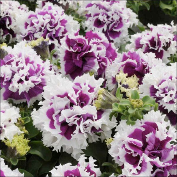 Petunia double grandiflora Pirouette F1. Изысканная махровая крупноцветковая петуния. Кусты компактные, хорошо разветвленные, высота 25-40 см, ширина 25-30 см. Сочетание двух цветов, высокая степень махровости и большие размеры цветка, диаметр 7-10 см, сделали эту петунию всеобщей любимицей. Отличается ранним, обильным цветением, повышенной стойкостью к неблагоприятным погодным условиям и способностью длительное время сохранять яркость расцветок. Выращивают рассадным способом. Посев проводят в конце февраля-марте. Семена петунии равномерно рассыпают по поверхности хорошо увлажненной земли, сбрызгивают водой из распылителя и накрывают стеклом или прозрачной пленкой. Всходы появляются через 7-12 дней. Пикировку проводят в фазе двух настоящих листьев. Рассаду высаживают на постоянное место, когда минует угроза заморозков. Используется для посадки на клумбах, рабатках, бордюрах, в балконные ящики и вазы, хорошо выглядит в подвесных кашпо.