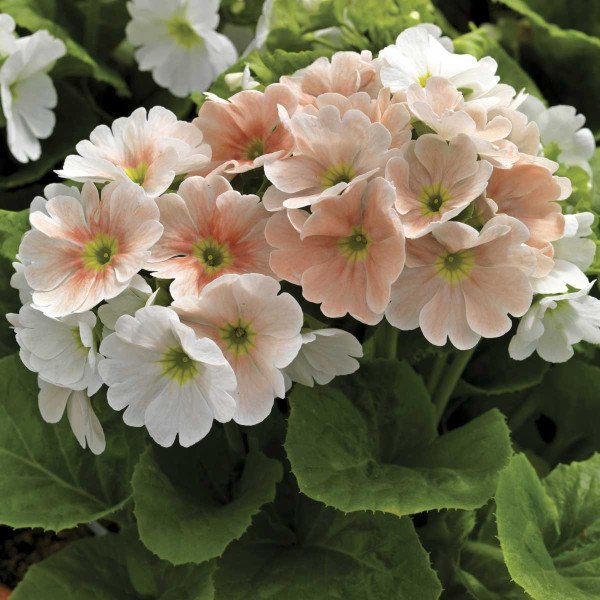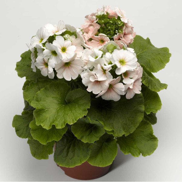 Примула Либре F1 лососевое пикоти характеризуется компактной кустовой формой, высота растения составляет 20-25 см, ширина - 15-20 см. Представители этой серии не содержат примина - вещества, которое может вызвать раздражение кожи при контакте с листьями, что делает растение безопасным для использования в декоративном озеленении. Сорт отличается высокой однородностью по морфологическим признакам и синхронностью начала цветения. Цветки имеют диаметр 4-6 см, собраны в зонтиковидные соцветия на удлиненных цветоносах и представлены в широкой палитре оттенков. Растение неприхотливо к условиям выращивания, при этом демонстрирует высокие декоративные качества. Период выращивания после высаживания в горшки составляет 10-12 недель.