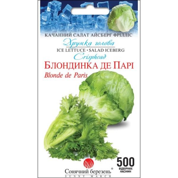 Салат Crisphead Blonde de Paris - это особенный, вкусный, слегка горьковатый ароматизированный салат. Этот тип салата Айсберг также известен как салат Батавия. Фирменные, светло-зеленые, большие головки салата окружены большими, светло-зелеными, сочными листьями, с мелкими частыми оборками. Этот тип имеет очень вкусные, нежные и хрустящие листья. Он немного легче растет, чем настоящий салат из листьев Айсберга. Созревает через 60 дней после всходов, хорошо переносит жару и повышенную влажность. Выращивается с ранней весны до поздней осени. Этот сорт можно также приготовить на пару, обжарить или приготовить в течение короткого времени.