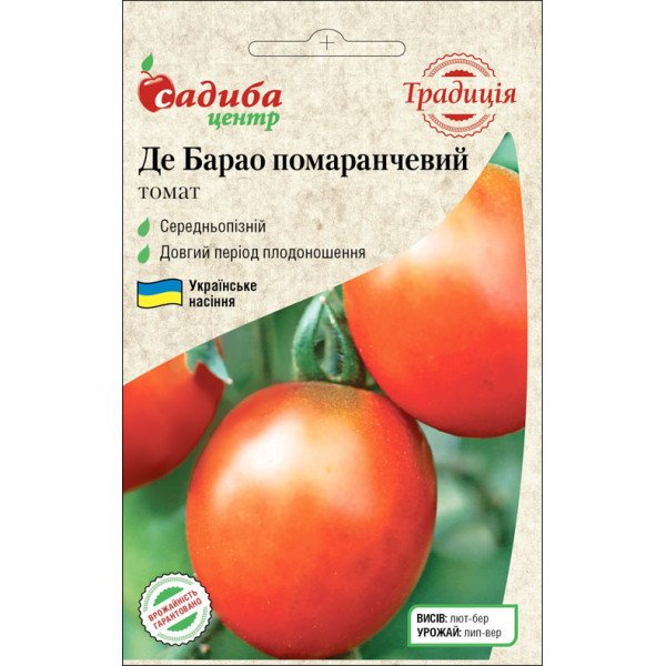 Томат Де Барао оранжевый - среднепоздний (120-125 дней) сорт высокорослого томата устойчивого к засухе и фитофторозу, для выращивания в открытом грунте или под пленочным укрытием. Растение высотой 1,5-2,0 м с мощным стеблем, сформированным в 1-2 побега. Плоды округло-овальные сливки оранжевого цвета, массой 60-100 г, собраны в кисти, с прочной кожицей и плотной мякотью. Отмечается долгим периодом плодоношения, высокой урожайностью, холодостойкостью, лежкостью, неподверженностью заболеваниям. Хорошо подходит в салатах, консервации, на столе свежими и засоленными, идеально подходит для изготовления сока.