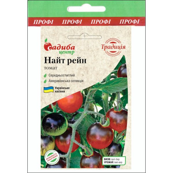 Найт Рейн - среднеспелый, индетерминантный сорт американской селекции. Плоды круглые, массой 50-80 г, растут гроздьями. Сначала плоды синего цвета, по мере созревания - нижняя часть становится красного цвета, а верхняя - черного. Мякоть красного цвета, ароматная, сладкая, мясистая с высоким содержанием витамина С. Семена высевают во второй декаде февраля - первой марта. После того, как образуется второй настоящий лист -пикируйте, углубляя до семядольных листочков. В открытый грунт высаживайте 55-60 дневную рассаду, только после угрозы весенних заморозков. Высадку на постоянное место лучше проводить в пасмурную, влажную погоду.