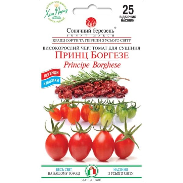 Итальянская реликвия из Тосканы, известная как помидор для сушки на солнце. Этот маленький, ароматный томат можно найти во дворах и фермах Италии, высушенным прямо на лозе и висящим на стенах или заполняющим стеллажи в кладовых, где сушеные плоды хранятся в зимние месяцы. Эти помидоры ценятся для сушки, потому что они сохраняют больше вкуса, чем другие сорта. Маленькие 15-20 г плоды очень сухие и имеют мало семян. У них богатый томатный вкус, который замечателен для соусов. Эти сливовидные с маленьким носиком помидоры растут в кистях из 7-10 плодов на урожайных 6-ти футовых (1,8 м) лозах. Помидоры Principe Borghese созревают, когда приобретают ярко-красный цвет и становятся слегка мягкими при сжатии. Они могут быть собраны на стадии «первого покраснения», когда цвета только начинают меняться, и дозревают при комнатной температуре, не уменьшая при этом свой вкус. Частый и ранний сбор увеличивает урожайность. На высоком, мощном кусте может быть до 500 плодов. У них насыщенный сладкий вкус, который замечателен для соусов, не теряется при замораживании и консервировании. Из них готовят выдающиеся жареные помидоры – порезанные пополам, политые оливковым маслом, запеченные до готовности и посыпанные свежим базиликом, орегано и др. прованскими травами. Среднеспелый сорт (100-120 дней от высадки). Формируются в 3-4 стебля с подвязкой на опоры.