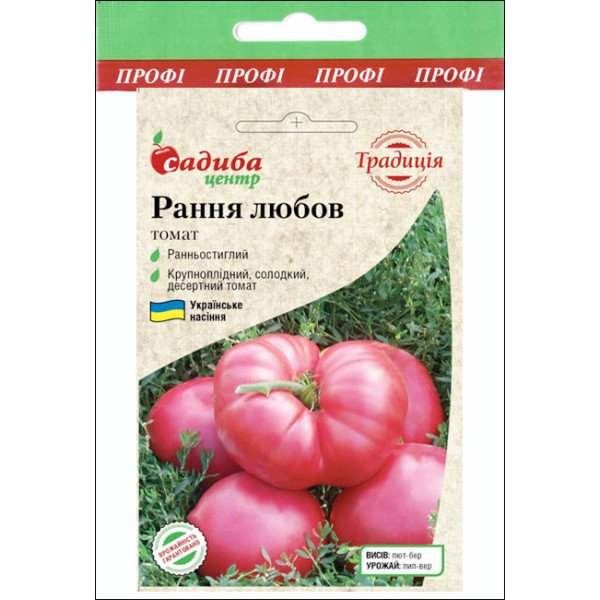 Ранняя любовь - раннеспелый, детерминантный (0,7 м) сорт. Плоды плоскоокруглой формы, розового цвета, массой 400 г. Листья картофельного типа. Благодаря быстрому созреванию плодов можно получить полноценный урожай до вспышки фитофтороза. Семена высевают во второй декаде февраля - первой марта. После того, как образуется второй настоящий лист - пикируют, заглубляя до семядольных листочков. В открытый грунт высаживайте 55-60 дневную рассаду, только после угрозы весенних заморозков. Высадку на постоянное место лучше проводить в пасмурную, влажную погоду.| Тип семян | Сорт |