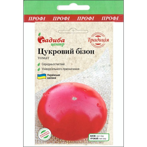 Томат Сахарный бизон - среднеспелый (90-100 дней) высокоурожайный крупноплодный сорт, рекомендованный для выращивания в закрытом грунте. Куст индетерминантный, раскидистый, высотой 180 см, требует подвязки и пасынкования. Плоды приплюснуто-округлые, слегка ребристые, розовой окраски, массой 350 г. Плотная сочная мякоть отличаются невероятным сладким вкусом и сильным ароматом. Урожайность 6-7 кг/м2. Ценится за устойчивость к грибковым болезням, высокую продуктивность, дружное созревание плодов, высокие вкусовые качества, которые прекрасно раскрываются в любом виде.