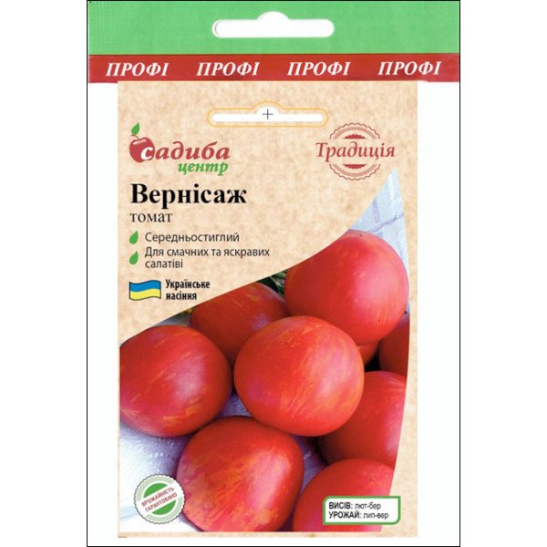 Вернисаж - среднеспелый, полудетерминантный (1,5 м) сорт. Плоды округлые, красные в желтые полосы, массой 40-60 г, растут гроздьями - по 6 на кисти. Отличаются приятным сладким вкусом. Семена высевают в первой половине февраля. После того, как образуется второй настоящий лист - пикируют, заглубляя до семядольных листочков. В фазе 4-х настоящих листочков проведите вторую пикировку в большие емкости. В открытый грунт высаживайте только после угрозы весенних заморозков. Высадку на постоянное место лучше проводить в пасмурную, влажную погоду. Используются в свежем виде, для переработки и сушки.| Тип семян | Сорт |
