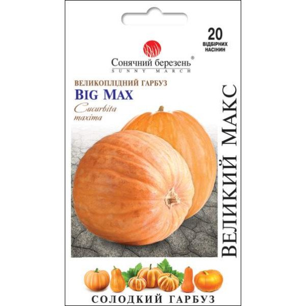 Если у Вас плодородная почва, много влаги и пространства, Big Max будет соответствовать своему названию. Огромные тыквы могут вырасти до веса более 50 кг! Почти круглые, до 80 см., в диаметре, ярко-оранжевые плоды с очень толстой, 10-сантиметровой яркой, желто-оранжевой мякотью. Хороши для пирогов и хранения. Эти тыквы типа Jack-o- Lantern действительно приятные, большие и тяжелые, достигающие 90 кг при выращивании для соревнований и выставок, традиционных для США. Для большего размера оставляйте только одну или две тыквы на лозу, прищипнув кончики стеблей после образования 3-5 плодов. Это будет способствовать их развитию и созреванию, которое наступает через 110-120 дней после всходов, а, также, увеличит потенциал при хранении. Специалисты выращивают хорошую крупную тыкву, которую нелегко поднять. Если плоды на грядке установлены вертикально, то они растут очень красиво, имеют красивую округлую форму, без деформации.