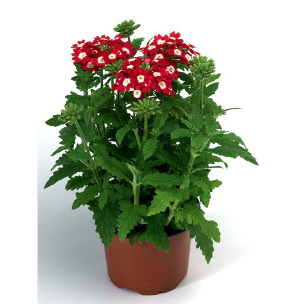 Вербена Обсешн F1 красная с глазком - очень однородная, ранняя и обильно цветущая серия, которая отличается высокой толерантностью к мучнистой росе. Куст компактный, высотой 15-20 см, шириной 25-30 см, прекрасно разветвленный, устойчив к вытягиванию. Серию можно выращивать в условиях высокой плотности культуры. Цветы большие, гвоздикообразные, с приятным ароматом, особенно вечером. Обильное цветение многочисленных боковых побегов удлиняет период декоративности. Время выращивания после посадки в горшки - 8-10 недель. Светолюбивое, холодостойкое, достаточно засухоустойчивое растение, к почвам нетребовательное. Идеально подходит для продажи рассады. Используют как горшечную культуру, в подвесных кашпо и в цветочном оформлении открытого грунта. Хорошо растет в условиях оранжерей и зимних садов.