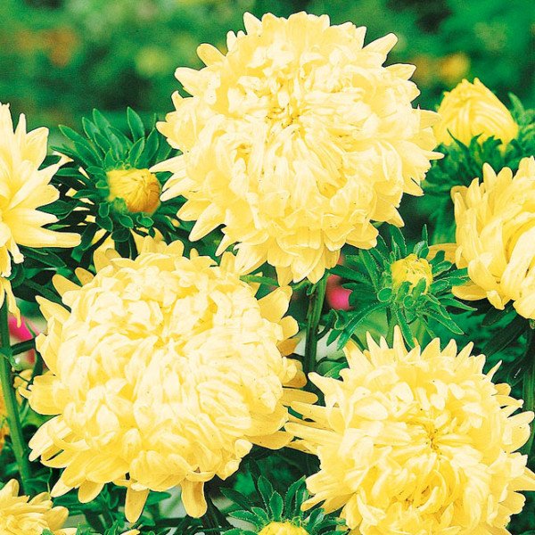 Callistephus chinensis Duchesse Yellow. Однорічна рослина, заввишки 70-80 см. Суцвіття півонієподібне, густо-махрове, діаметром 10-13 см. Тривалість цвітіння до 65 днів. На розсаду насіння висівають у березні-квітні. Пікіровку проводять у фазі 2-3 справжніх листочків за схемою 5x5. У відкритий ґрунт рослини висаджують у середині травня. При безрозсадному способі насіння висівають на постійне місце ранньою весною або під зиму. Невибаглива у вирощуванні, добре реагує на підживлення. Використовується для озеленення і зрізу.
