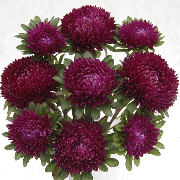 Callistephus chinensis Syringa Purple. Серія, яка зачаровує надзвичайно великими, схожими на хризантему суцвіттями, діаметром 12-15 см. Кущ пірамідальної форми, вирізняється гарним ростом і міцними стеблами. Висота - 60-70 см. На одній рослині формується 6-8 квітконосів, які чудово підходять для зрізу.