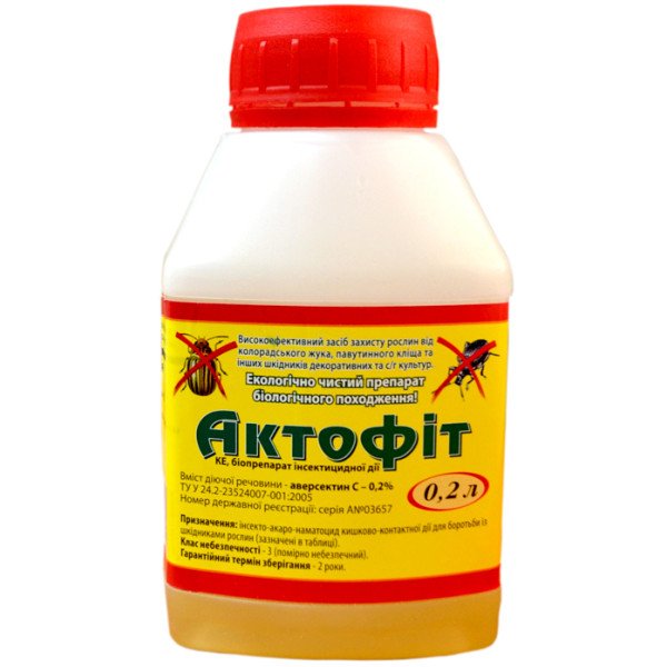 Актофіт - високоефективний біопрепарат для захисту рослин відкритого і закритого ґрунту від листогризучих і сокосисних шкідників: колорадського жука, трипсів, павутинного кліща, попелиці, совок, листокруток, плодожерок та ін. Біопрепарат Актофіт Дозволяє виростити екологічно чисті продукти.