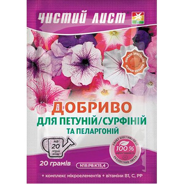 Добриво для петуній і пеларгоній /20 г/ *Чистий лист*