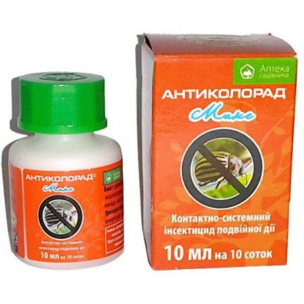 Антиколорад Макс - високоефективний інсектицид, що має одночасно акарицидні та репелентні властивості дії. Застосовується для захисту багатьох культур і плодових дерев від комах-шкідників.