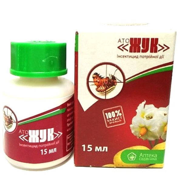 АТО Жук - трикомпонентний інсектицид, що володіє контактно-системною дією, призначений для знищення колорадського жука, совок, трипси, попелиці та картопляної молі. Регламент застосування: картопля. Також, препарат рекомендований до застосування на плодових культурах, буряках і капусті.