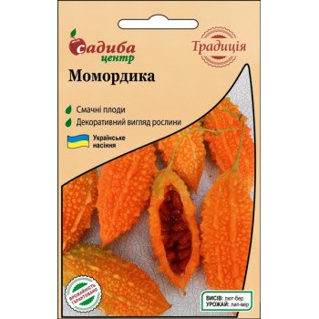 Насіння Момордика, фасування 8 насінин Момордика — однорічна ліана заввишки 4–5 м із декоративним різьбленим листям. У фазі повної стиглості плоди набувають яскраво-помаранчевого забарвлення, а їх соковитий околоплідник рубінового кольору за смаком нагадує хурму, тоді як м’якуш плоду подібний до гар..