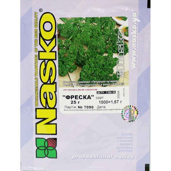 Середньоранній сорт кучерявої петрушки. Період від повних сходів до проведення першого зрізання зелені - 60-70 днів. Рослини середньої висоти. Листова розетка потужна, розлога, напівпіднесена. Листя середнього розміру, темно-зелене, сильно гофроване, ніжне. Після зрізання зелень дуже добре відростає. Цінується сорт за рясну ароматичну зелень. Сорт придатний для вирощування у відкритому і захищеному ґрунті. Петрушка віддає перевагу родючим, з глибоким орним шаром, пухким суглинним і супіщаним ґрунтам. Найкращі попередники: огірки, томати, цибуля. Посів насіння рекомендуємо проводити в кілька термінів: ранньою весною (кінець квітня - початок травня), під зиму (жовтень - листопад), у середині літа (наприкінці червня). Насіння висівають рядами з відстанню між рослинами 3-4 см і міжряддями 20-30 см. Рекомендується для споживання як у свіжому, так і сушеному вигляді. Урожайність листя - 3-5 кг/м2. Даний сорт виділяється високим виходом листової маси (лист сильно гофрований), швидким відростанням після зрізання і високими ароматно-смаковими якостями.
