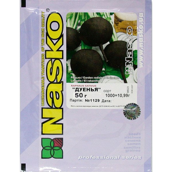 Середньостиглий сорт чорної редьки з високою лежкістю, товарністю та смаковими якостями коренеплодівСередньостиглий сорт чорної редьки. Від повних сходів до технічної стиглості 60-75 днів. Коренеплоди - великі, масою 200-450 г, округлої форми, гладкі. Поверхня коренеплоду чорного кольору, м'якоть - щільна, соковита, біла, солодкувато-гострого смаку. Сорт - холодостійкий і позитивно реагує на поливи. Виділяється дружним формуванням врожаю, високою врожайністю (до 9 кг/м2) і товарністю плодів. Середньостиглий сорт призначений для споживання у свіжому вигляді в осінньо-зимовий період. Тривалого зберігання. Редька віддає перевагу легким, багатим органічними речовинами ґрунтам. Посів насіння здійснюється наприкінці червня. Насіння висівають у борозенки, розташовані одна від одної на відстані 35-40 см на глибину 1-2 см. Сходи слід прорідити, залишаючи між рослинами близько 10 см. Догляд за рослинами надалі включає в себе регулярні поливи і розпушування.
